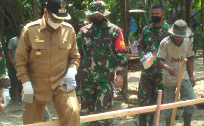 Bireuen – Bupati Bireuen Dr H Muzakkar A Gani SH MSi, bersama Kasrem 011/Lilawangsa, Letkol Czi M Ridha Has ST MT didampingi Dandim 0111/ Letkol Inf Zainal Abidin Rambe SSos melakukan peletakan Batu Pertama pembangunan satu unit rumah layak huni tipe 36 milik Mulyadi (34) salah satu masyarakat miskin yang sehari -hari, bekerja sebagai buruh tani, di Dusun Likot Apui Desa Alue Limeng Kecamatan Jeumpa Kabupaten Bireuen, Selasa kemarin (02/03/2021). Pembagunan rumah layak huni untuk Mulyadi diberikan melalui program TMMD Reguler Ke-110 Tahun 2021 Kodim 0111/Bireuen yang bertemakan TMMD Wujud Sinergi Membangun Negeri.