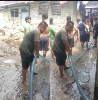 Disitu, terlihat sejumlah pemuda dan anak – anak saling berbagi tugas membersihkan lumpur tebal sisa banjir beberapa hari yang lalu. Ada yang membuang tumpukan sampah disetiap rumah warga, dan ada yang menyemprot lumpur pakai selang.
