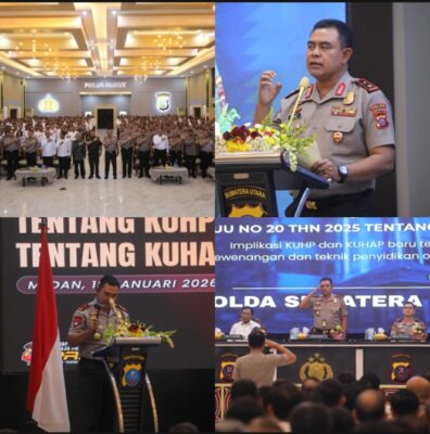 Dalam sambutannya, Kapolda Sumut menegaskan bahwa pemberlakuan KUHP dan KUHAP yang baru merupakan momentum penting sekaligus tantangan besar bagi seluruh aparat penegak hukum, khususnya Polri, dalam melakukan transformasi pola pikir dan pola kerja penegakan hukum.