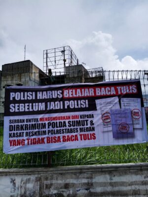Medan – medianasionalnews. Kekecewaan masyarakat dengan kinerja oknum polisi, diduga membuat masyarakat malas berurusan dengan Polisi. Pasalnya, terpampang spanduk diseputaran bundaran SIB bertuliskan” Polisi Harus Belajar Baca Tulis Sebelum Jadi Polisi. Disitu, juga tertulis ” Seruan untuk mengundurkan diri kepada Dirkrimum Polda Sumut, Wasidik Ditreskrimum Polda Sumut dan Kasat Reskrim Polrestabes Medan yang tidak bisa baca tulis.
